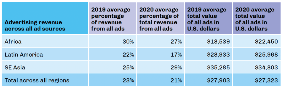 Advertising was the second largest revenue category in our global sample, making up just over 23% of total revenue in 2019, and 21% in 2020. Average ad revenue across all three regions was $28,319 in 2019, and $27,323 in 2020.