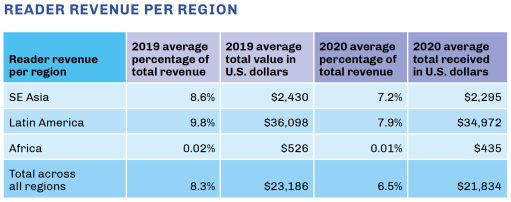 The drop in ad revenue in 2020 is consistent with the loss of advertising revenue experienced by many media around the world during the first year of the pandemic, although these digital native media organizations lost less revenue, as a percentage of income, than daily newspapers.
