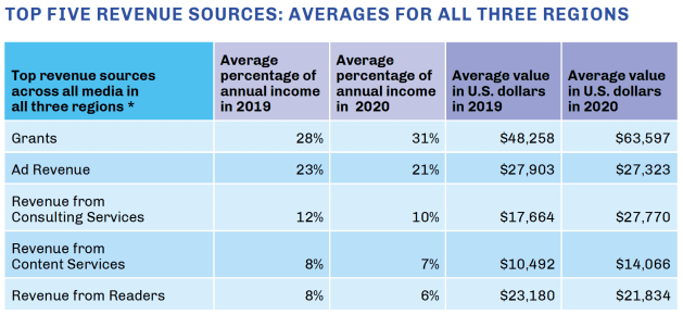 Across all of the media in all three regions in this study, in both 2019 and 2020, the top revenue categories were grants, advertising, consulting services, content services, and reader revenue, in that order.