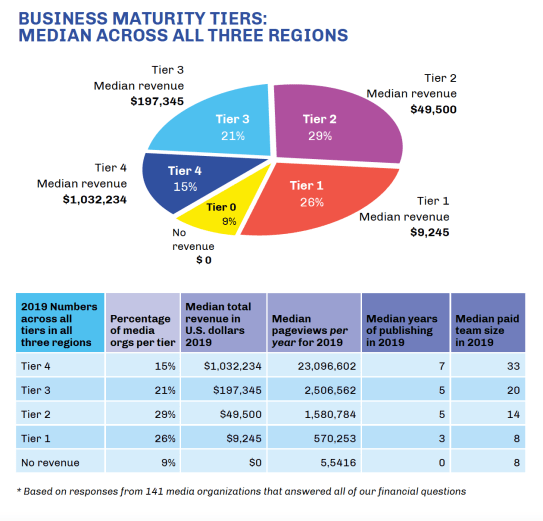 Because we selected such a broad range of media organizations for this study-100 from Latin America, 52 from Southeast Asia, and 49 from Afica--we found that the best way to compare them was to divide them into four distinct tiers of business maturity, based on total revenue, number of page views, team size, and how many years they had been publishing. (We used the same tiers in our 2016 report.)