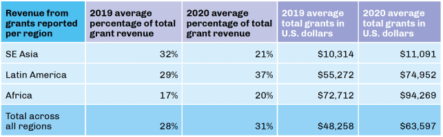 In both 2019 and 2020, grants were the primary source of income in all three regions.